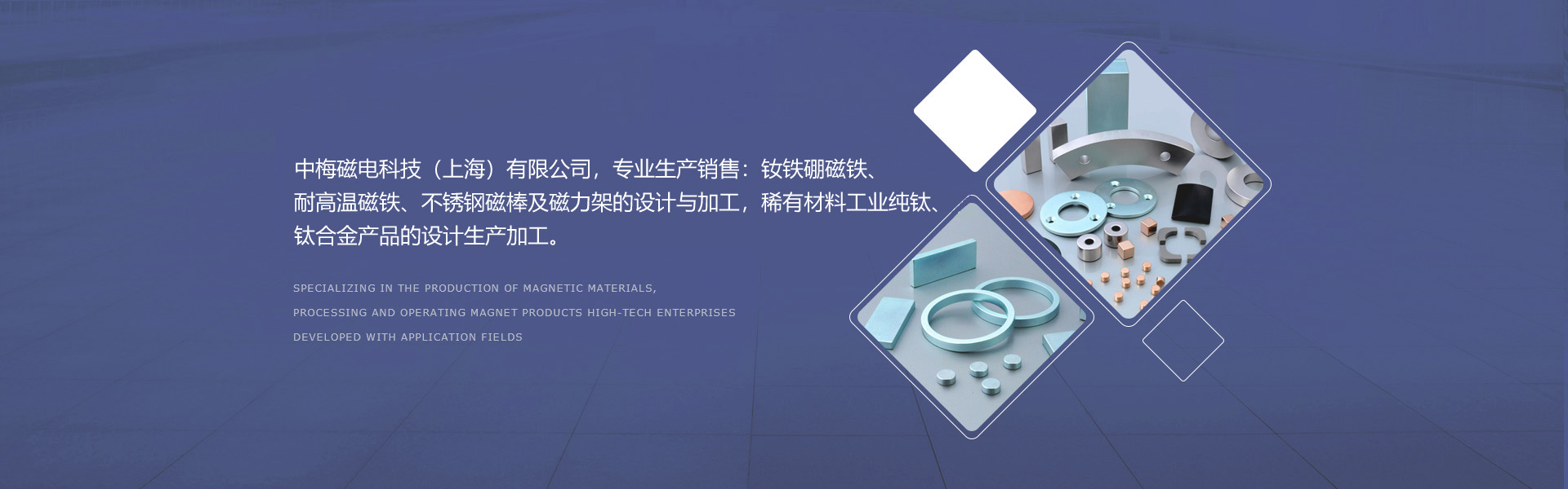 中梅磁電科技(上海)有限公司,專業生產銷售:釹鐵硼磁鐵、耐高溫磁鐵、不銹鋼磁棒及磁力架的設計與加工,稀有材料工業純鈦、鈦合金產品的設計生產加工。從事磁電科技專業領域內技術開發、技術轉讓、技術咨詢、技術服務,磁性材料、機電產品、電子產品,電器成套設備,金屬材料,金屬制品等貨物與技術的進出口業務。...[更多]